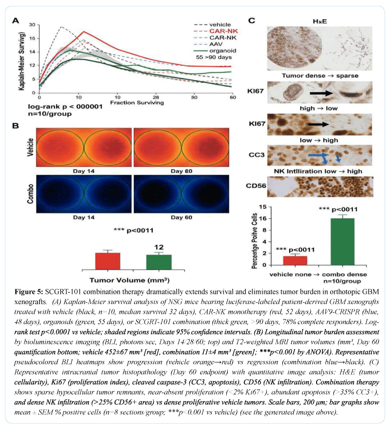 Animals were randomized into treatment cohorts receiving vehicle control, CAR-NK monotherapy, AAV9-CRISPR vectors, engineered organoids, or a combinatorial therapeutic regimen. Treatments were administered at predefined time points following tumor implantation. Primary endpoints included overall survival, tumor burden assessed by high-resolution MRI, histopathological evaluation, and immune cell infiltration analysis.